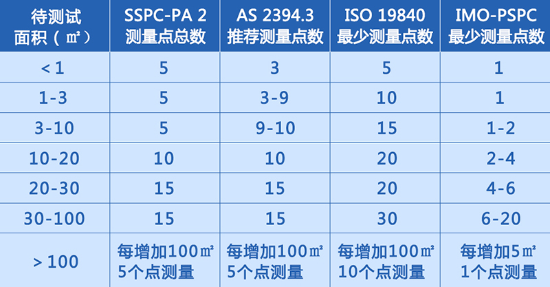 干膜厚度即涂層硬化或固化后,基層表面上保留的涂層厚度。干膜厚度測試主要有SSPC-PA 2、AS 2394.3 、ISO 19840 、IMO-PSPC MSC 215 (88) 四種標(biāo)準(zhǔn),不同測量標(biāo)準(zhǔn)的測試點情況如下:
