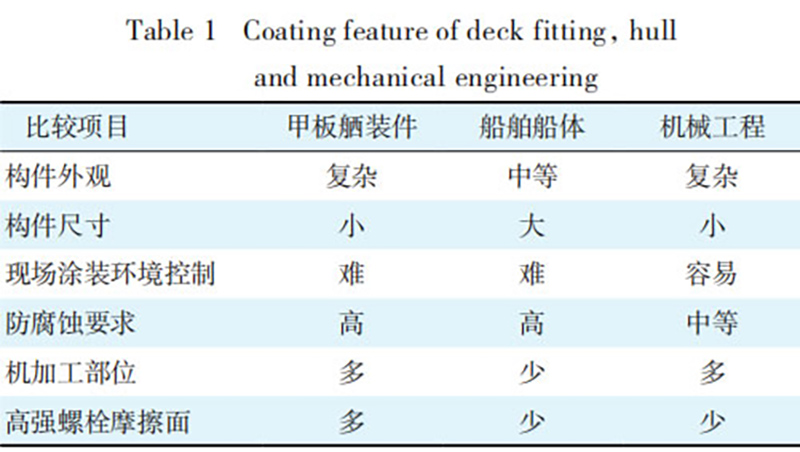 很多甲板舾裝件的外觀和作用類(lèi)似于工程機(jī)械,其涂裝要求也比較復(fù)雜。為了保證足夠的抗滑移系數(shù),一些區(qū)域(如高強(qiáng)螺栓摩擦結(jié)合面)僅進(jìn)行表面處理而無(wú)需涂裝。既不進(jìn)行表面處理也不涂裝的部位主要是甲板舾裝件的精加工面,精加工面對(duì)表面的平面度有極高的要求,涂裝會(huì)使精加工表面的平面度下降,甚至還會(huì)產(chǎn)生其他危害。同時(shí)甲板舾裝件和船體一樣,需要面對(duì)惡劣的海洋腐蝕環(huán)境,當(dāng)然,甲板舾裝件的腐蝕環(huán)境比壓載艙略好一點(diǎn)。應(yīng)對(duì)這種腐蝕環(huán)境有3 種處理方法:選用耐腐蝕鋼材、熱浸鍍鋅和進(jìn)行嚴(yán)格的涂裝處理。在涂裝時(shí)需要對(duì)一些區(qū)域在表面處理或涂裝前進(jìn)行保護(hù),為了滿(mǎn)足使用要求,甲板舾裝件的涂裝兼具工程機(jī)械涂裝的復(fù)雜性和船舶涂裝的高耐腐蝕要求,表1 列出了甲板舾裝件、船體、機(jī)械工程、建筑鋼結(jié)構(gòu)的涂裝特點(diǎn)。
