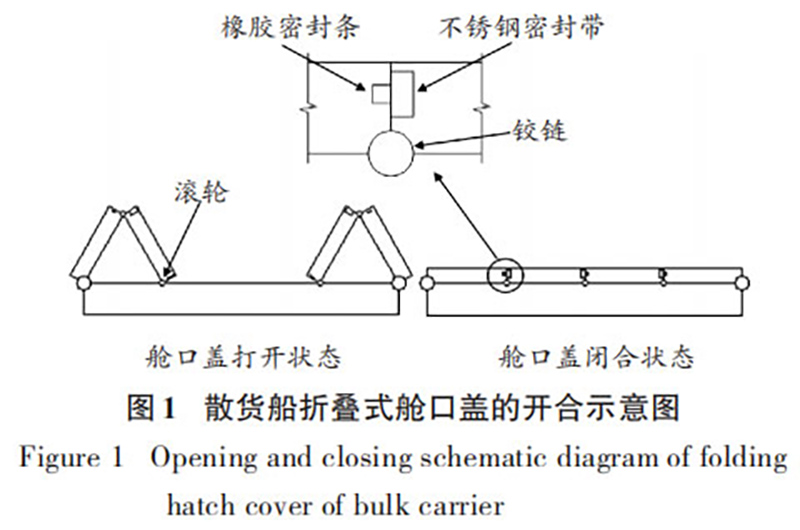 圖1 為折疊式艙口蓋的開(kāi)合示意圖,圖2 為工人正在給艙口蓋鉸鏈預(yù)裝鋼軸,以確定鋼軸與鉸鏈的尺寸是否匹配。和精加工面類(lèi)似,不銹鋼密封帶也不能進(jìn)行噴砂和涂裝,否則會(huì)影響密封條和橡膠條的契合,密封效果變差導(dǎo)致漏水,污染艙內(nèi)貨物,因不銹鋼密封帶多采用無(wú)磁性的奧氏體不銹鋼制造,磁性橡膠無(wú)法吸附。常用的噴砂前保護(hù)方法有2 種,一是點(diǎn)焊薄鋼板進(jìn)行保護(hù),噴砂完成后拆除薄鋼板;二是在噴砂過(guò)程中對(duì)不銹鋼所在的區(qū)域不進(jìn)行噴砂處理,噴砂結(jié)束后采用打磨或其他方式對(duì)不銹鋼附近需要處理的碳鋼表面進(jìn)行表面處理,在噴砂過(guò)程中不銹鋼密封帶可能會(huì)受到鋼砂輕微的濺射,可采用拋光機(jī)進(jìn)行拋光處理。