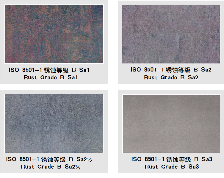 | Sa1 輕度的噴射清理 | 在不放大的情況下觀察時(shí),表面應(yīng)無(wú)可見(jiàn)的油、脂和污物,并且沒(méi)有附著不牢的氧化皮、鐵銹、涂層和外來(lái)雜質(zhì)。 |