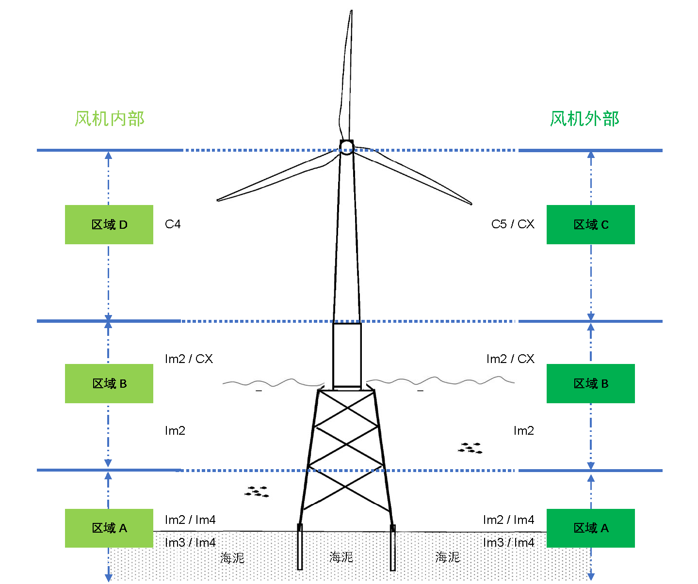 海上風電的腐蝕環(huán)境較為嚴酷,其腐蝕區(qū)域可分為:海洋大氣區(qū)、浪濺區(qū)、潮差區(qū)、海水全浸區(qū)和海泥區(qū),風電機組。