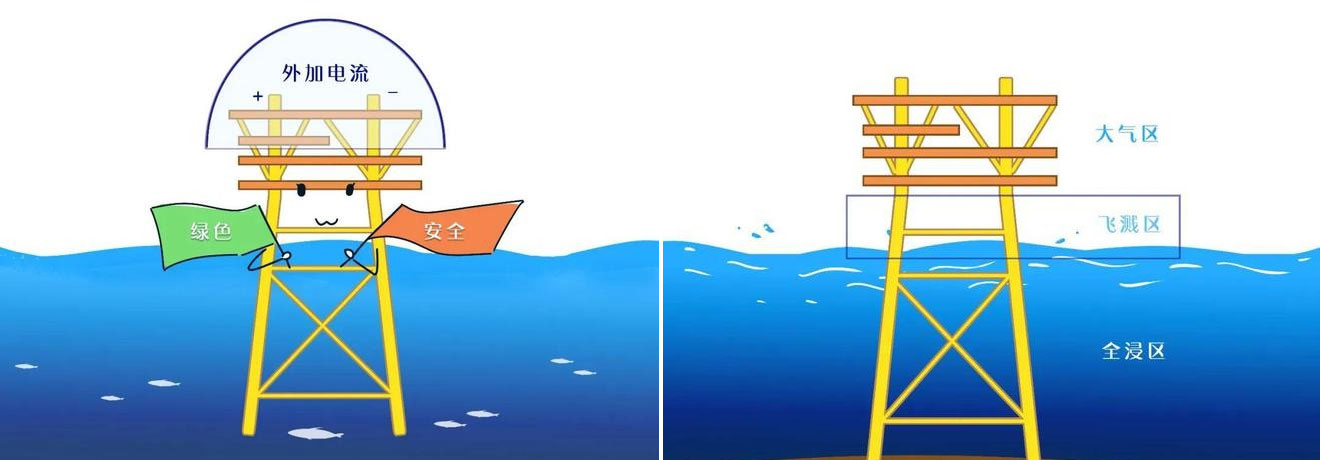浪濺區(qū)與潮差區(qū)均為干濕交替區(qū), 表面鹽含量高于大氣區(qū),海水氧含量高于全浸區(qū),同時海水中夾雜的泥沙和海面浮游物體對其進行沖刷撞擊,因此形成了最為苛刻的腐蝕環(huán)境。一般腐蝕速率為 0.3-0.5mm/ 年,最高可大 1mm/ 年,約為全浸區(qū)的 3-10 倍。