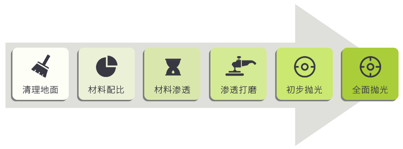 在地面完全干透后,將配比好的材料灑在地面上。在滲透過(guò)程中,用拖把或者推水刮將材料推均勻,讓材料滲透到混凝土內(nèi)部。需要再次提醒的是在上材料之前。一定要確保地面完全干透,材料才能被地面充分吸收。材料浸泡時(shí)間一般在2~3小時(shí),可根據(jù)地面實(shí)際情況進(jìn)行調(diào)整。