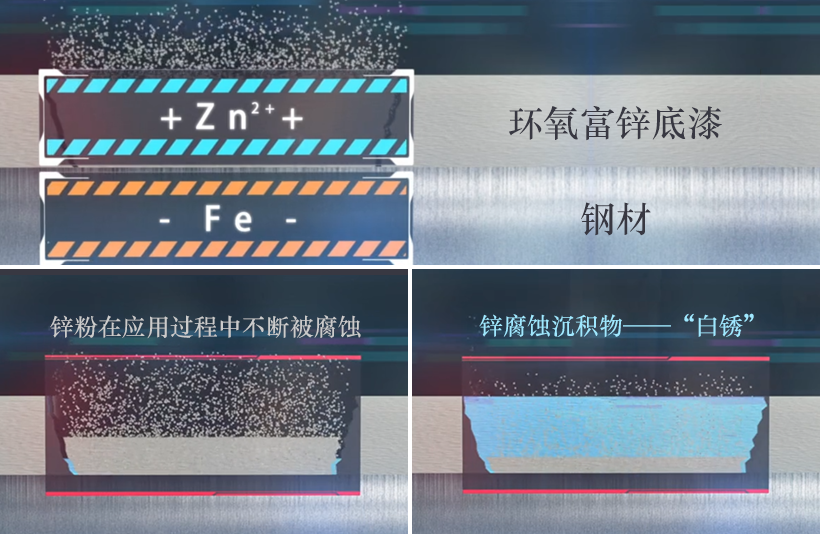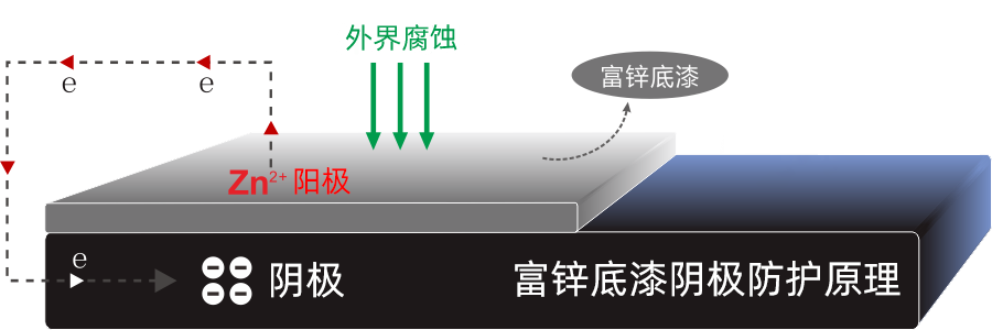 陰極保護(hù):較高含量的鋅粉具有陰極保護(hù)作用,起到電化學(xué)防腐功能,同時生成的鋅鹽具有良好的屏蔽緩蝕作用。