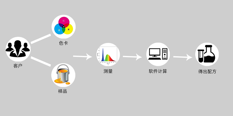 傳統(tǒng)的人工配色需要查找配方并且反復(fù)測試,夢能工業(yè)涂料可以為您提供更便捷高效的配色流程。在儀器測出樣品顏色后,系統(tǒng)在自己的配方中心查找配方并自動修色,最后達到精準(zhǔn)匹配。