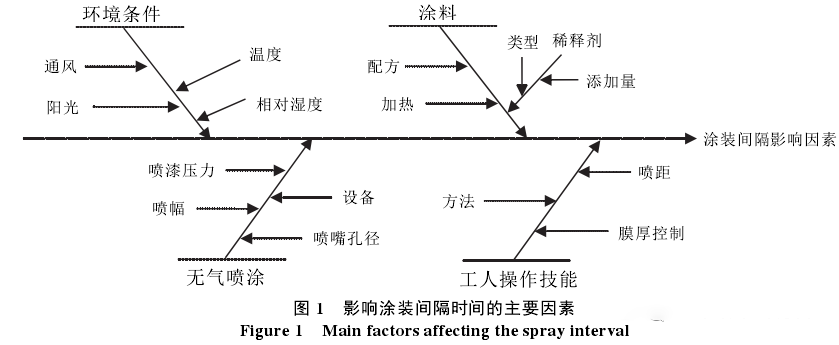 影響涂裝間隔時間的主要因素包括環(huán)境條件,涂料(稀釋劑)類型,涂裝工藝,操作工人等四大因素?;蛘哒f,涂裝間隔時間與環(huán)境溫濕度、漆膜厚度、涂層數(shù)及漆膜的暴露情況有關(guān)。