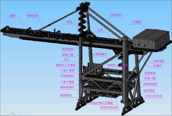 1、組成:岸橋、場橋、軌道行車、裝船機、螺旋卸載機、斗輪機、門座式起重機、臺架吊、浮吊、固定吊、皮帶運輸機等;
