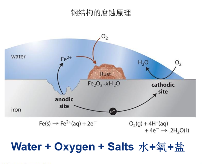 腐蝕沉積物屏蔽保護。環(huán)氧富鋅在實際在腐蝕后期過程中,金屬鋅粉漆在應(yīng)用過程中不斷被腐蝕,鋅粉間隙和鋼鐵表面沉積了腐蝕產(chǎn)物,即堿式碳酸鋅,俗稱“白銹”,其結(jié)構(gòu)致密,且不導(dǎo)電,是難溶的穩(wěn)定化合物,能夠阻擋和屏蔽腐蝕介質(zhì)的侵蝕,起到防蝕效果,因此也被譽為鋅粉漆的“自修復(fù)”性。