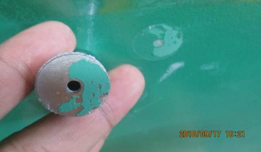 (6)用拉力儀套上鋁合金圓柱,轉(zhuǎn)動(dòng)手柄進(jìn)行測(cè)試,記錄下破壞強(qiáng)度(MPa),以及破壞狀態(tài)。用百分比表示出涂層與底材、涂層之間、涂層與膠水以及膠水與圓柱間的附著力強(qiáng)度及狀態(tài);