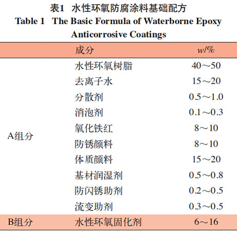 根據(jù)《水性環(huán)氧樹脂防腐涂料》(HG/T 4759—2014)標(biāo)準(zhǔn)要求,結(jié)合客戶施工環(huán)境、施工方式、配套方案等要求,確定基礎(chǔ)配方,見表1。
