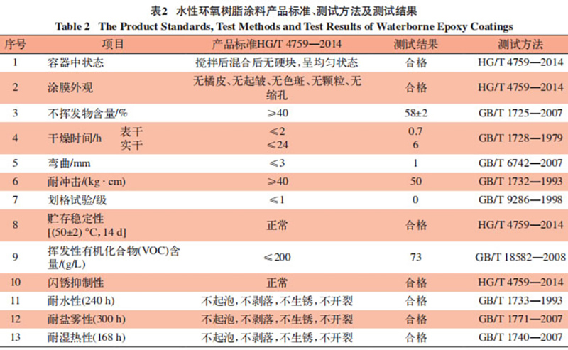按照產(chǎn)品行業(yè)標(biāo)準(zhǔn)HG/T 4759—2014,對(duì)涂料及涂層的各項(xiàng)性能進(jìn)行測(cè)試,測(cè)試結(jié)果見表2。本實(shí)驗(yàn)涂膜耐水性、耐鹽霧性、耐濕熱性性能檢測(cè)中,根據(jù)客戶實(shí)際使用需求,樣板膜厚為(55±5) μm,且耐鹽霧試驗(yàn)采用樣板劃線法(樣板中間劃一條劃痕)進(jìn)行;實(shí)驗(yàn)中涂膜耐水性與耐濕熱性在涂膜無(wú)異常情況下,分別達(dá)到720 h、600 h后停止測(cè)試。