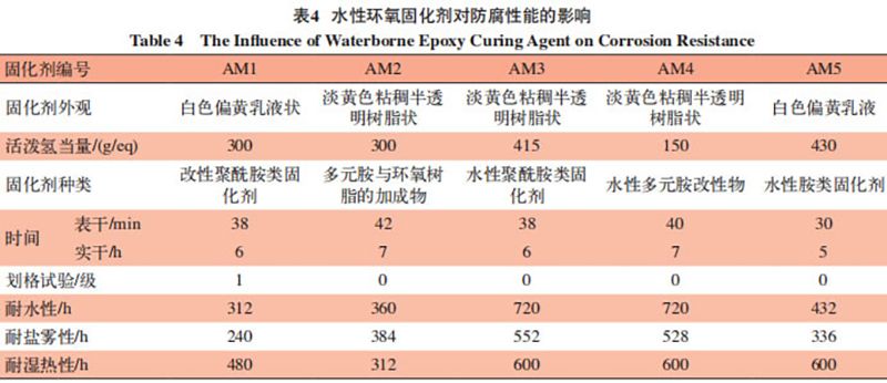 通過(guò)表4可以看出,不同水性環(huán)氧固化劑所制備涂膜在干燥時(shí)間、耐水性、耐鹽霧等性能上存在明顯差異。固化劑AM1所制得涂膜干性良好,耐水性、耐鹽霧性、耐濕熱性均較差;固化劑AM2所制得涂膜干性一般,耐水性、耐鹽霧性、耐濕熱性一般;固化劑AM3所制得涂膜干性良好,具有優(yōu)異耐水性、耐鹽霧性、耐濕熱性;固化劑AM4所制得涂膜干性一般,耐水性、耐鹽霧性、耐濕熱性良好;固化劑AM5所制得涂膜干性優(yōu)良,耐水性、耐鹽霧性、耐濕熱性一般。