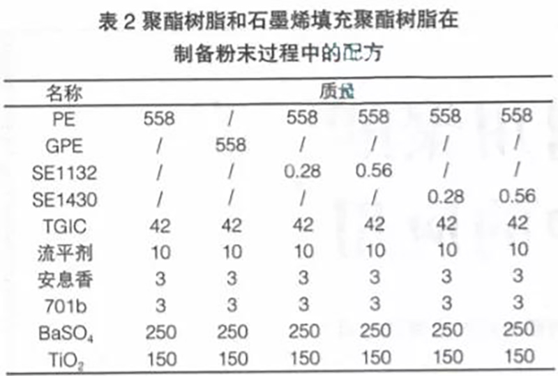 PE、GPE在制備過(guò)程中的配方見(jiàn)表1,另外還可以用過(guò)在配料階段外加石墨烯的方式(hydrid)制備含石墨烯的粉末涂料。