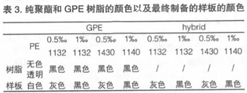 表3為純聚酯以及GPE樹(shù)脂的顏色和最終制備的樣板顏色。從表格中知道純樹(shù)脂本身呈現(xiàn)出無(wú)色透明。當(dāng)在合成聚酯過(guò)程中添加石墨烯時(shí)發(fā)現(xiàn)最終制得的產(chǎn)品外觀上面表現(xiàn)為黑色,分析分為這應(yīng)該是多層石墨烯本體的顏色造成的。