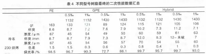 表4是不同型號(hào)的樹(shù)脂制備成粉末樣板時(shí)耳朵二次性能數(shù)據(jù)匯總,從表中知道隨之石墨烯的加入,其整體的膠化時(shí)間(gt)呈現(xiàn)出下降的趨勢(shì),表明石墨烯的加入有利于增強(qiáng)粉末涂料的活性。