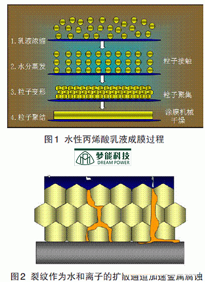 水性丙烯酸樹脂一般由乳液聚合法制備,其水性丙烯酸乳液的成膜過程主要包括4個階段(如圖1所示):(1)涂覆后水分開始蒸發(fā),乳液逐漸變得濃稠;(2)隨著乳液中水分的繼續(xù)揮發(fā),乳膠粒子逐漸靠攏并相互接觸達到密集狀態(tài);(3)當水分蒸發(fā)到一定程度時,乳膠粒子間隙變小并形成細小的毛細管,在毛細管極壓作用下發(fā)生形變并逐漸融合,直到粒子間界面消失;(4)此階段中,乳膠粒子聚結(jié)老化并達到機械干燥狀態(tài),最終乳液會在金屬表面形成一層致密的保護膜。