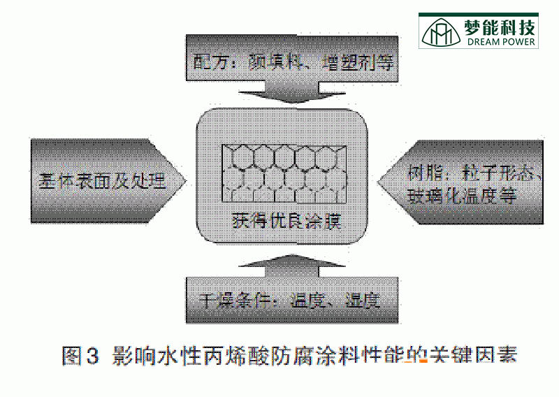 為得到性能良好的水性丙烯酸防腐涂料以及避免涂膜過早失效,在制備丙烯酸乳液時應盡可能考慮多方面因素對涂膜產(chǎn)生的影響(圖3),例如選擇性能優(yōu)良的丙烯酸樹脂作為成膜物質(zhì)、選擇合適的配方以及對基體表面進行良好的處理等。