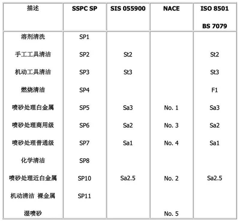 國際通用表面處理標(biāo)準(zhǔn)對比