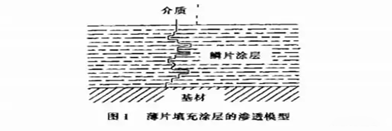 玻璃鱗片防腐涂料的防腐機理與鋁粉和云鐵在涂層中起到的作用類似,通過改變腐蝕介質(zhì)(如空氣、水、酸堿等)的擴散滲透路線,使其難以滲透到基材來達到防腐蝕效果。