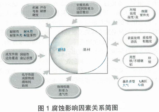 隨著工業(yè)技術(shù)的快速發(fā)展,環(huán)境保護(hù)問(wèn)題已經(jīng)越來(lái)越受到全世界的重視。特別是在中國(guó),政府機(jī)構(gòu)聲明在2015年初開(kāi)始對(duì)溶劑涂料廠商征收高達(dá)4%的消費(fèi)稅。由于粉末涂料的VOC幾乎接近于零,這對(duì)于粉末涂料廠商是個(gè)好消息,將會(huì)提供更多的發(fā)展契機(jī)與政府的大力支持。粉末涂料已廣泛應(yīng)用到許多領(lǐng)域,諸如建筑、汽車、管道、移動(dòng)通信和家用電器等。粉末涂料行業(yè)中,涂料防腐的工作與研究一直沒(méi)有間斷過(guò)。有關(guān)橋梁、建筑物、飛機(jī)、汽車與輸氣管道等腐蝕破壞的報(bào)道司空見(jiàn)慣。盡管在油氣管道行業(yè)中已經(jīng)開(kāi)發(fā)出一種有效的陰極保護(hù)措施,但仍存在涂層破壞的情況。涂層破壞的影響因素很多,這可能受到包括成膜物質(zhì)、顏填料、助劑、基材類型、前處理工藝、固化工藝、涂層厚度與涂層附著力在內(nèi)涂料系統(tǒng)的影響,也可能包括溫度、濕度、細(xì)菌與紫外線在內(nèi)外部環(huán)境的影響。所有腐蝕影響因素間的關(guān)系如圖1所示。