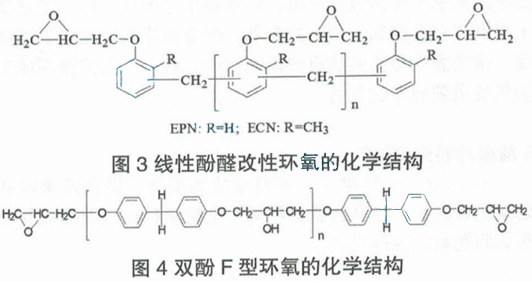 除了雙酚A型環(huán)氧,線性酚醛改性環(huán)氧與雙酚F型也可用于防腐粉末涂料中,兩者的化學(xué)結(jié)構(gòu)圖如圖3與圖4所示。