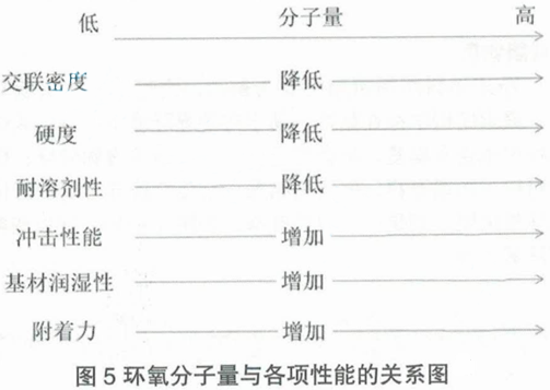 從化學(xué)結(jié)構(gòu)上分析,線性酚醛改性環(huán)氧同雙酚A型環(huán)氧與F型環(huán)氧相比,單位摩爾物質(zhì)中含有更多數(shù)目的環(huán)氧基團(tuán)與芳香環(huán),固化后交聯(lián)結(jié)構(gòu)更為致密,具有更優(yōu)良的防腐性能,但同時(shí)也存在脆性這一缺陷,一般很少在粉末涂料中單獨(dú)使用。在重防腐粉末涂料中,線性酚醛改性環(huán)氧往往與雙酚A型環(huán)氧共混使用,以達(dá)到優(yōu)良的防腐性能與力學(xué)性能。粉末涂料用雙酚F型環(huán)氧主要是為改善涂料的流平性,也可同雙酚A型環(huán)氧共混使用。除了化學(xué)結(jié)構(gòu),分子量也是影響環(huán)氧各項(xiàng)性能的重要因子,其影響情況如圖5所示。同高分子量環(huán)氧相比,由于低分子量環(huán)氧含有更多數(shù)目環(huán)氧基團(tuán),固化后涂層的交聯(lián)密度增大,進(jìn)而涂層的硬度增加,柔韌性與沖擊強(qiáng)度降低。低分子量環(huán)氧比高分子量環(huán)氧結(jié)構(gòu)中含有較少數(shù)目的羥基,也會(huì)降低涂層與基材間的潤(rùn)濕性與附著力。綜合環(huán)氧各項(xiàng)性能考慮,環(huán)氧的分子量須在一定范圍內(nèi),或大或小均會(huì)影響到涂層的防腐性能。在重防腐領(lǐng)域中,環(huán)氧的分子當(dāng)量一般在700-900g/eq,分子量分布較窄。