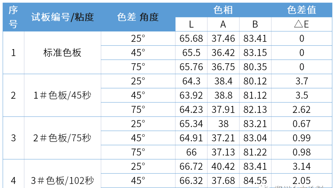 施工黏度對色差也有影響。同一種漆,采用不同的黏度進(jìn)行施工,獲得涂層的色差值是不一樣的,而且差別很大。這是因?yàn)槭┕ゐざ扔绊懫崮さ耐庥^質(zhì)量所致。取某公司“工程黃”水性面漆噴涂不同黏度的色板,其中1#色板黏度45 s、2#色板黏度75 s、3#色板黏度102 s時,進(jìn)行色差效果比較,對照結(jié)果見下表。