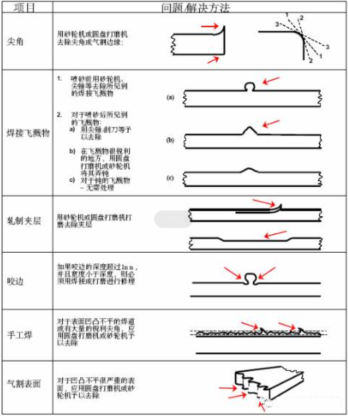 3)凹坑、夾層等鋼材表面缺陷要用砂輪或電焊補平的方法進行修整。