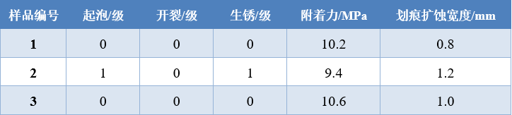從表3可以看出,三種風電涂料均具有優(yōu)異的耐鹽霧性能,在經(jīng)過2000小時的鹽霧試驗后均無開裂,樣品2涂料試板出現(xiàn)1級很輕微的起泡和1級很輕微生銹現(xiàn)象,樣品1涂料試板和國外廠家的涂料試板均無起泡、生銹和開裂出現(xiàn)。鹽霧試驗后進行拉開法附著力試驗,三種試板的付著力分別為10.2 MPa、9.4 MPa和10.6 MPa,鹽霧試驗后的付著力較優(yōu)異,劃痕處擴蝕寬度分別為0.8 mm、1.2 mm 和1.0 mm,三種試板的腐蝕擴展程度都較輕,這說明我們國內的風電涂料產(chǎn)品在耐鹽霧腐蝕性方面可以和國外產(chǎn)品媲美。