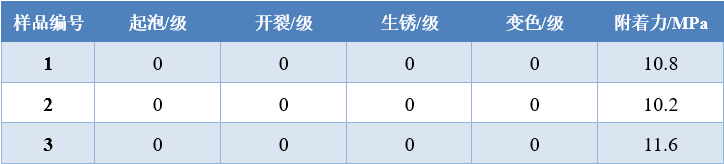 從表4中可以看出,在經(jīng)冷熱循環(huán)試驗后,三種涂層試板均未出現(xiàn)起泡、開裂、生銹和變色現(xiàn)象,試驗后付著力分別為10.8 MPa、10.2 MPa和11.6 MPa,這說明所有涂層體系都就有優(yōu)異的耐冷熱循環(huán)性能。在中性鹽霧試驗進行到1000 h后,所有涂料試板的非劃痕區(qū)均未出現(xiàn)任何異常腐蝕現(xiàn)象,那么理論上來說,冷熱循環(huán)試驗后,同樣的涂層體系也不應出現(xiàn)異常涂層缺陷。