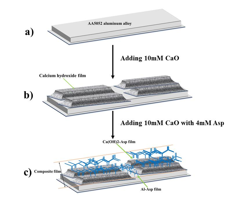 在現(xiàn)有的研究中,無機(jī)物和有機(jī)物復(fù)配緩蝕劑應(yīng)用最多,其中,無機(jī)物常見的有金屬氧化物、稀土元素等,分別與氨基酸類、葡萄糖等多糖類、表面活性劑等有機(jī)大分子物質(zhì)配合使用,以氧化鈣與L-天冬氨酸為代表,在堿性電解質(zhì)中氧化鈣形成的氫氧化鈣通過幾何覆蓋效應(yīng)附著在鋁合金表面,在充分發(fā)揮自身緩蝕效力的同時(shí),還充當(dāng)了“針線”,將天冬氨酸分子與鋁離子和氫氧化鈣充分“連接”起來,織成了細(xì)密的“網(wǎng)”—— Ca(OH)2-L-Asp和Al-Asp單分子復(fù)合膜層,從而有效的抑制了鋁合金的析氫腐蝕反應(yīng)。