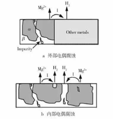 03鎂具有較低的電極電位,當與陰極接觸時極易發(fā)生電偶腐蝕,通常情況下,陰極是與鎂合金接觸的其他金屬材料,或者鎂合金內部的第二相和雜質元素,分別稱為外部電偶腐蝕和內部電偶腐蝕,如下圖所示。Fe,Ni,Cu等元素具有低氫過電位,通常充當高效陰極,在鎂合金中會導致嚴重的電偶腐蝕。