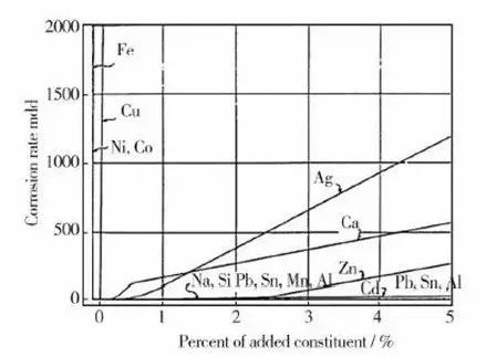 影響鎂合金耐蝕性的主要因素有合金成分、顯微組織、腐蝕介質。通過測試不同含量Fe、Ni、Cu等雜質元素的鎂合金的腐蝕速率表明,隨著雜質元素含量的增加,鎂合金的腐蝕速率急劇下降,如下圖所示。這些雜質元素在鎂中具有低的固溶度,常常形成金屬間化合物,并與鎂合金基體構成原電池,加速鎂合金的腐蝕。