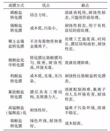 化學轉化膜層與基體結合良好,擁有特定的孔隙,可以與有機層形成良好的結合,適用于環(huán)境溫度和表面質量精度要求不高的構件。無鉻轉化膜技術受到廣泛關注,如磷酸鹽、高錳酸鹽、釩基鹽、稀土金屬鹽以及錫酸鹽處理等。非鉻酸鹽轉化方式及其優(yōu)缺點如下: