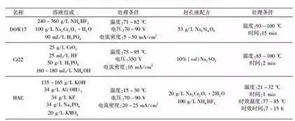 陽極氧化膜空隙大、無規(guī)則、分布不均勻,如果不進行封閉,耐蝕性非常差,因此需進行后續(xù)的封孔處理,使其既美觀又耐蝕。如下表所示,處理液中含有鉻化合物,污染嚴重,因此逐漸開發(fā)了磷酸鹽等環(huán)保型陽極氧化工藝。