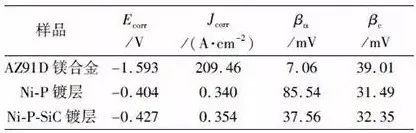 2) 金屬/化合物涂層。金屬涂層主要是采用化學鍍和電鍍的方法在鎂合金基體表面涂覆一層金屬涂層。對AZ91的研究表明,經Ni-P與Ni-P-SiC化學鍍后,自腐蝕電位與AZ91基體相比明顯正移(見下表),腐蝕電流明顯降低,說明化學鍍層可以提高AZ91鎂合金的耐蝕性,而添加SiC顆粒對耐蝕性的影響不大。