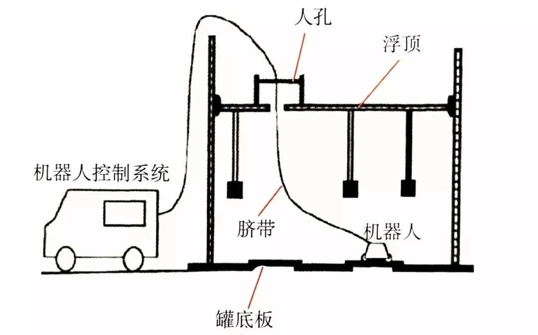 國外已經(jīng)推出數(shù)個型號的機器人產(chǎn)品用于儲罐的在線檢測,可以節(jié)省開罐、清罐所耗費的成本,檢測效率高,經(jīng)濟效益明顯。但也存在以下不足:對罐內(nèi)介質(zhì)有要求,不適合檢測淤積層較厚的原油儲罐;對罐內(nèi)結構有要求,內(nèi)浮頂類型儲罐投放機器人比較困難,內(nèi)部有加熱盤管的儲罐,為避免臍帶纏繞盤管,檢測范圍大為受限;機器人內(nèi)部的電路系統(tǒng),用于原油、成品油儲罐檢測,安全風險較大。