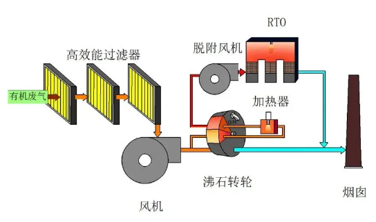 沸石轉(zhuǎn)輪脫附產(chǎn)生的高濃度廢氣通過RTO風(fēng)機(jī)進(jìn)入RTO內(nèi)進(jìn)行焚燒,使廢氣中的VOC高溫分解為CO2和H2O。
