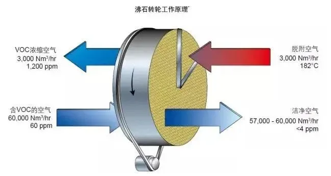 沸石轉(zhuǎn)輪是一種可連續(xù)進(jìn)行吸附和脫附操作的氣體凈化裝置,兩側(cè)由密封裝置分成三個(gè)區(qū)域:吸附區(qū)、脫附區(qū)及冷卻區(qū)域。