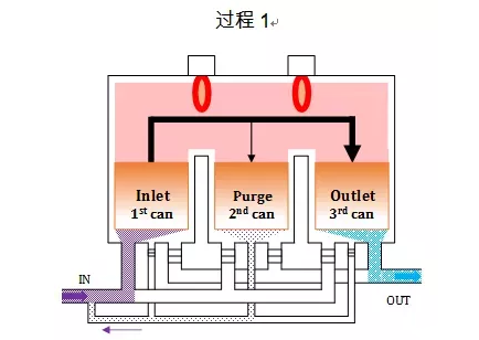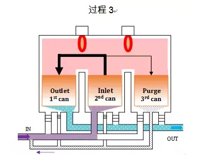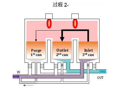 三室體在過程1中蓄熱體被加熱儲存了熱能,閥門切換氣流,第三室體成為“入口”。從一室體引入未經(jīng)處理的氣體,將被吹掃返回到工藝氣體中,以避免在開關(guān)切換期間排放未經(jīng)處理的氣體。
