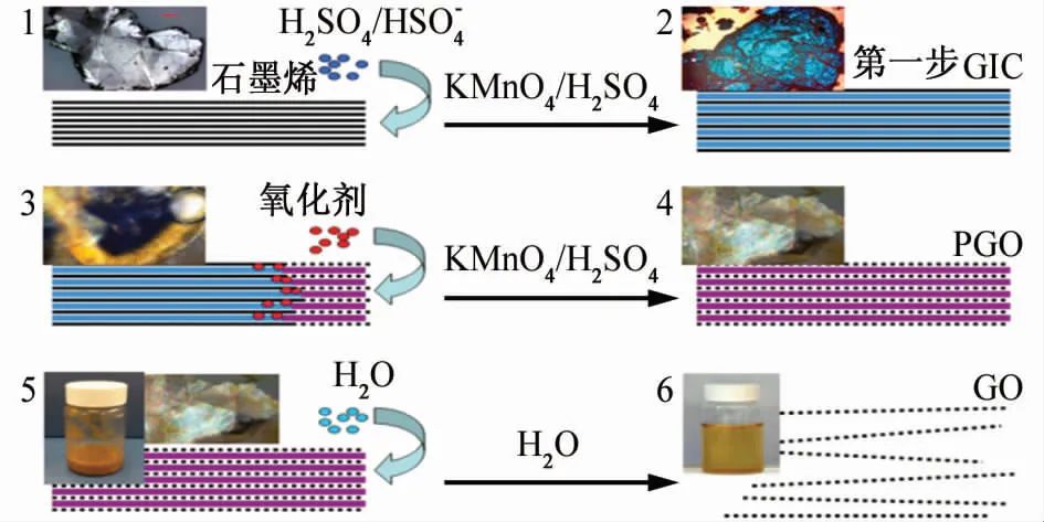 傳統(tǒng)、經(jīng)典的氧化石墨烯制備方法有Brodie、Staudenmaier、Hummers三種,都是將石墨或石墨烯作為制備原料與不同的強(qiáng)氧化劑進(jìn)行氧化反應(yīng),然后剝離得到氧化石墨烯。Brodie法是采用發(fā)煙HNO3體系,以KClO3為氧化劑;Staudenmaier法是采用濃H2SO4和發(fā)煙HNO3混合酸體系,以KClO3為氧化劑。雖然這兩種方法的氧化程度高,但前者的第一步氧化無法在同一容器中一步完成,需要分批氧化、純化;后者為了保持氧化劑濃度,需要在濃硝酸和濃硫酸混合物中加入大量KClO3,這會產(chǎn)生大量ClO2、NO2、N2O4等有害氣體。Hummers法是以石墨為原料,濃硫酸、高錳酸鉀、硝酸鈉為氧化劑,經(jīng)過低溫氧化,中溫氧化插層,高溫剝離、過濾洗滌,分散干燥等過程,得到單層或多層氧化石墨烯。