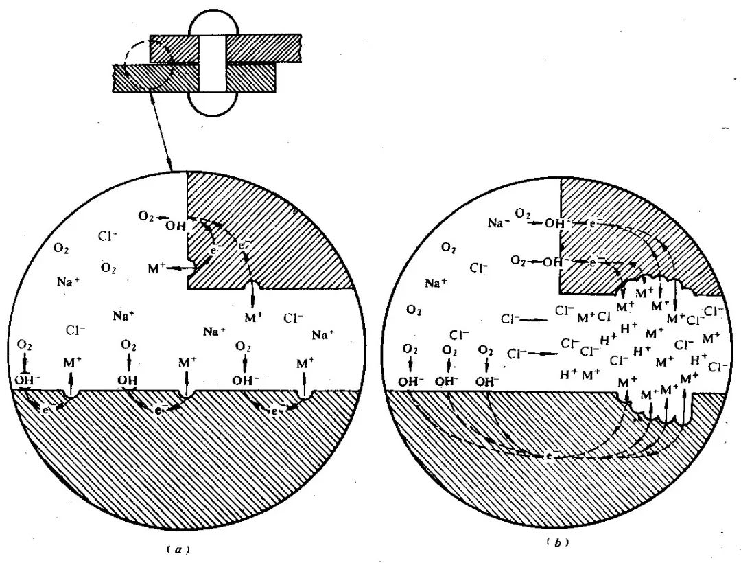 腐蝕產(chǎn)生的條件是金屬表面上由于存在異物或結(jié)構(gòu)上的原因會造成縫隙,此縫隙的寬度一般在0.025mm~0.1mm范圍內(nèi)。其縫隙要成為縫隙腐蝕的部位,其寬度須使液體能流入,又能維持液體停滯。這樣的縫隙在實際中是常見的,這也是金屬縫隙腐蝕成為常見的一種局部腐蝕形式的重要原因之一。纖維材料(如墊片連接件)可通過毛細作用而把溶液吸進墊片和金屬之間的縫隙內(nèi),因而特別容易引起縫隙腐蝕。