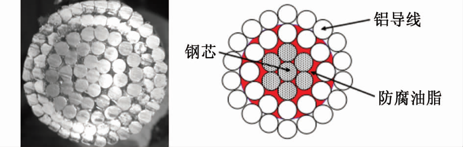 架空輸電導(dǎo)線最早采用的防腐蝕措施是涂覆防腐蝕油脂(防腐脂),在美國、日本以及歐洲等發(fā)達(dá)國家,防腐脂產(chǎn)品的研究起步較早。早在1927年美國第一次將凡士林涂覆在導(dǎo)線接頭上,之后歐洲一些國家及日本使用瀝青混合物、羊毛脂混合物、潤滑脂混合物、特制金屬皂基潤滑脂混合物等作為防腐蝕材料。自20世紀(jì)60年代起,伴隨工業(yè)發(fā)展,涂油絞線的使用量逐漸增多,在歐洲、北美及南美的重工業(yè)區(qū)及沿海地區(qū),新建線路基本上全部采用涂油絞線。防腐脂有效阻止了腐蝕介質(zhì)滲入絞線內(nèi)部,在鋁線和鋼線之間形成物理隔絕,研究表明涂覆防腐脂可使鋼芯鋁絞線的壽命延長10年。目前,按防腐脂涂覆方式可將涂油絞線分為輕、中和重防腐蝕絞線。涂防腐脂鋼芯鋁絞線的截面形貌如圖1所示。