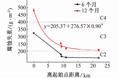 圖2所示為廣東茂名和云浮兩地的工業(yè)污染大氣環(huán)境的腐蝕監(jiān)測(cè)點(diǎn)數(shù)據(jù)圖。兩組數(shù)據(jù)的采集點(diǎn)分別位于火力發(fā)電廠污染區(qū)和水泥廠污染區(qū)周?chē)?,污染區(qū)中心位置酸性氣體質(zhì)量濃度分別高達(dá)13.1μg/m3和16.3μg/m3,屬于C3及以上腐蝕級(jí)別(腐蝕等級(jí)按照腐蝕嚴(yán)重性由高到低一般分為C1~C5級(jí))。