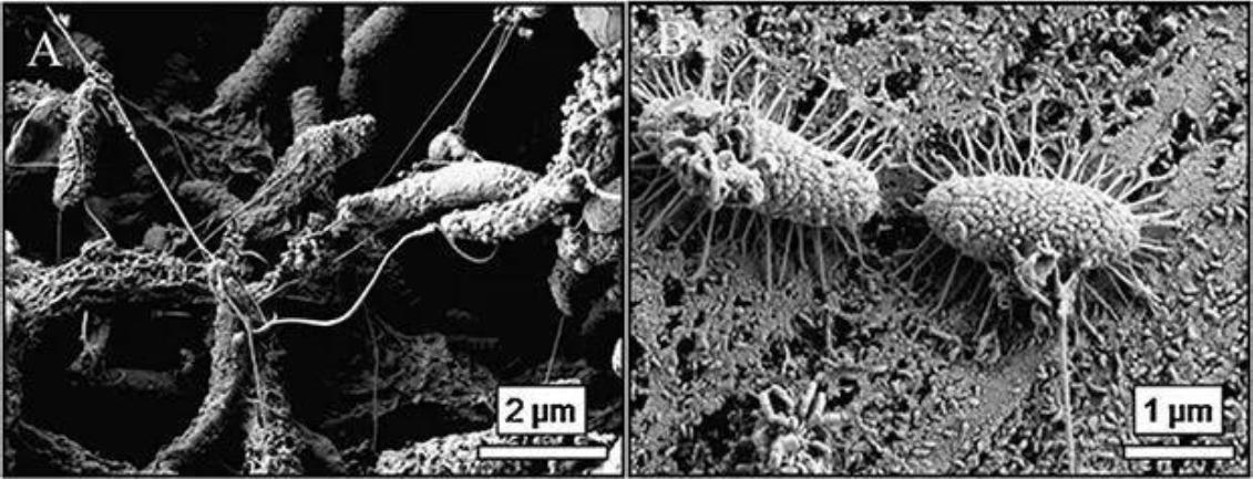 其次是鐵氧化菌,正是它們的存在,推動了地球鐵元素的循環(huán)(Fe2+氧化成Fe3+)。但是,在這個循環(huán)過程中,原本可溶的亞鐵化合物轉(zhuǎn)變?yōu)殡y溶的三價鐵化合物(如Fe(OH)3),逐漸沉積。在鐵制品金屬表面,大量的沉積物會聚集結(jié)痂,從而加速金屬腐蝕發(fā)生。生活中我們常見的鐵制品上面的斑斑銹跡,通常都是這樣產(chǎn)生的。然而鐵氧化菌十分奇特,它們對金屬的腐蝕行為并非一直表現(xiàn)為加速腐蝕,當生物膜和腐蝕產(chǎn)物膜形成致密保護層時,會對金屬基底起到一定保護作用。然而這種保護并不可靠,當生物膜附著到一定厚度之后會逐漸脫落,金屬材料所在環(huán)境中的腐蝕性離子會繼續(xù)對其進行腐蝕。