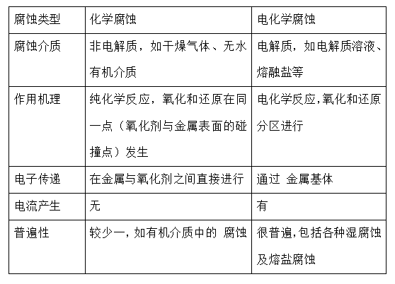 從化學(xué)反應(yīng)類型來(lái)看,無(wú)論化學(xué)腐蝕,還是電化學(xué)腐蝕都屬于氧化一還原反應(yīng),這是兩類腐蝕的共同之處。但是,兩者間的區(qū)別主要是金屬和氧化劑之間的作用機(jī)理不同,具體可歸納列于表: