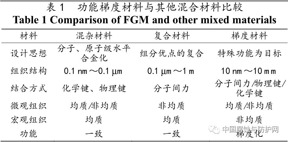FGM 由兩種或多種材料組成,組分、結(jié)構(gòu)均呈連續(xù)梯度。它要求功能、性能隨內(nèi)部位置的變化而變化,實(shí)現(xiàn)功能梯度的材料。FGM 與混雜材料、復(fù)合材料在設(shè)計(jì)思想、組織結(jié)構(gòu)、宏觀組成等方面有本質(zhì)不同,具體如表 1 所示。