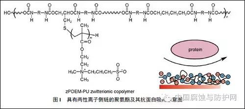 抗蛋白材料主要基于海洋污損是由蛋白質(zhì)、糖蛋白等在基體表面吸附開始的這一產(chǎn)生機(jī)理發(fā)展的。該類材料中研究最多的是聚乙二醇和兩性離子聚合物,其他還有兩親性聚合物、水凝膠、兩性離子液體等。這些材料在海洋中的長效防污性有待考查。圖1 為具有兩性離子側(cè)鏈的聚氨酯結(jié)構(gòu)式及其形成的涂層抗蛋白吸附示意圖。