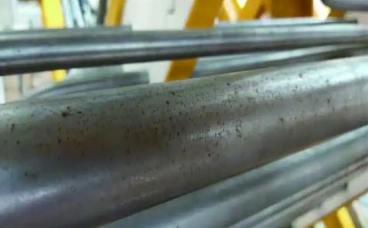 陰極保護(hù)電流對不銹鋼鈍化膜的影響較為復(fù)雜,極化電位不同可能會導(dǎo)致表面鈍化膜變化。鈍化膜在雙相不銹鋼管線整體防腐蝕體系中仍然發(fā)揮著重要的防護(hù)作用,特別是對于欠保護(hù)或電流屏蔽處管線。游離鐵會導(dǎo)致雙相不銹鋼表面污染從而影響鈍化膜的形成,如圖5所示。雙相不銹鋼管線的表面處理和噴涂應(yīng)在獨(dú)立的車間或?qū)S脠龅剡M(jìn)行,噴砂和作業(yè)環(huán)境均需與碳鋼作隔離處理。