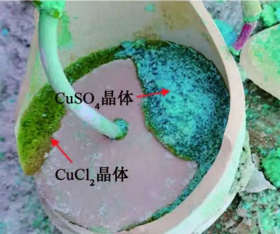 柴達木盆地的鹽漬土分布廣泛,根據(jù)土壤檢測結果,主要特點如下:戈壁、沙漠等極干燥土壤中含鹽量相對較低,一般小于10%;低洼濕潤或干濕交替土壤中含鹽量高,一般為10%~45%,最高甚至可達80%。失效的硫酸銅長效參比電極形貌如圖1所示,電極內(nèi)溶液已干涸,底部析出藍色硫酸銅晶體和黃綠色氯化銅晶體,表明此電極在使用過程中,土壤中的大量氯離子滲透進入了參比電極內(nèi)部。氯離子滲透進入長效參比電極腔體的速度和含量取決于土壤中氯離子含量、土壤濕潤程度、土壤性質(zhì)和土壤干濕變化情況。柴達木盆地中大量鹽湖和低洼鹽堿區(qū)的土壤鹽含量高、地下水位高,部分位置管道甚至浸泡在飽和鹽水中,氯離子污染程度最高。